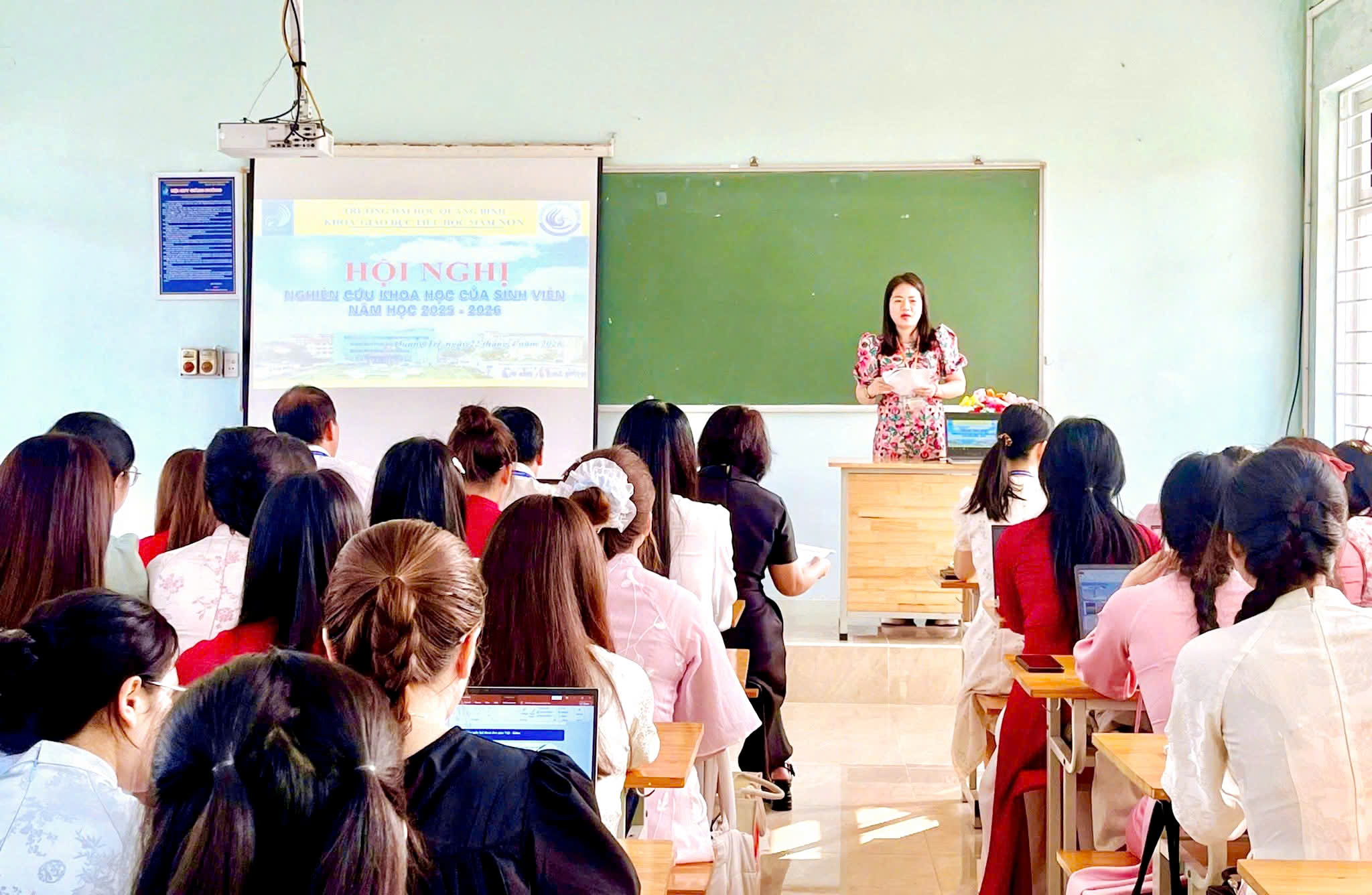 Sáng ngày 22/04/2026, tại phòng A201 và A202, Trường Đại học Quảng Bình đã long trọng tổ chức Hội nghị Nghiên cứu Khoa học Sinh viên năm học 2025–2026. Hội nghị có sự tham dự của Ban điều hành gồm: TS. Vương Kim Thành – Trưởng khoa, ThS. Phạm Thị Diệu Vinh – Phó Trưởng khoa; cùng Thư ký hội nghị ThS. Phan Thị Thu Hà và đông đảo giảng viên, sinh viên nghiên cứu khoa học.